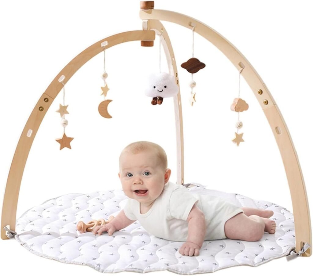 The Wooden Baby Gym Play Mat is a beautifully designed activity center that supports early learning and sensory development for newborns. Crafted with a sturdy wooden frame, it offers a safe and natural play environment for baby girls and boys. The soft floor mat provides a comfortable space for babies to lie, stretch, and explore during tummy time or playtime. This foldable activity gym is easy to store and transport, making it perfect for both home use and travel. It includes 5 hanging sensory toys that stimulate your baby’s visual, tactile, and motor skills. Inspired by Montessori principles, the gym encourages independent play and natural curiosity. Each toy is thoughtfully designed to support hand-eye coordination and grasping skills. The neutral and modern design blends seamlessly with any nursery or living room décor. Parents appreciate the non-toxic, baby-safe materials used for peace of mind. The wooden frame is durable and stable, ensuring long-lasting use as your baby grows. This developmental gym helps strengthen muscles during tummy time and supports early physical development. The foldable design allows quick setup and easy storage when not in use. Suitable for newborns and infants, it provides age-appropriate stimulation from the earliest stages. The sensory toys can be adjusted or removed to customize playtime. Lightweight yet sturdy, the gym is easy to move around the house. It promotes focus, exploration, and independent play without overstimulation. Ideal as a baby shower gift, it combines functionality with aesthetic appeal. The activity mat is easy to clean, helping maintain hygiene for daily use. This gym supports early cognitive and motor development in a fun and engaging way. Investing in this Wooden Baby Gym Play Mat gives your baby a safe, stylish, and educational start to life.