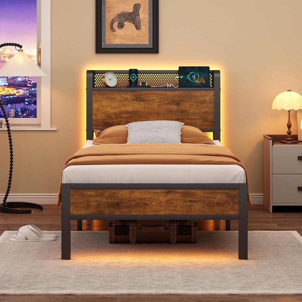 Upgrade your bedroom with the Twin Bed Frame with Charging Station and LED Lights, combining modern design, functionality, and comfort in one stylish piece. This twin-size platform bed features a sturdy combination of rustic wood and strong metal support, ensuring durability and long-lasting performance without the need for a box spring. Built-in LED lights along the headboard create a cozy, ambient glow, perfect for reading, relaxing, or setting a calm mood. The integrated charging station with USB ports keeps your devices powered overnight, eliminating clutter from cords and chargers. Heavy-duty construction supports weight evenly, providing a safe and stable sleep surface. The noise-free design ensures peaceful, undisturbed rest every night. Storage-friendly headboard adds extra functionality, perfect for keeping books, alarm clocks, or personal items within easy reach. The modern rustic finish adds character and style to any bedroom décor. Easy assembly with clear instructions allows you to set up your bed quickly and efficiently. The platform design eliminates the need for a box spring, saving money and simplifying your bedroom setup. LED lights are energy-efficient, long-lasting, and adjustable to create the perfect atmosphere. Ideal for kids, teens, or guest bedrooms where style and functionality matter. USB ports make it convenient to charge phones, tablets, or e-readers without additional adapters. Sleek design combines practicality with aesthetic appeal, enhancing any room’s ambiance. Strong metal frame ensures safety and durability for daily use. Ample under-bed clearance provides storage options for bins, shoes, or other essentials. Perfect for modern bedrooms, dorms, apartments, or small spaces requiring multifunctional furniture. Combines comfort, technology, and convenience in a single, stylish bed frame. Ideal for anyone seeking a practical yet stylish solution for sleep, storage, and device charging. Overall, the Twin Bed Frame with Charging Station and LED Lights delivers durability, modern features, and convenience for a complete bedroom upgrade.